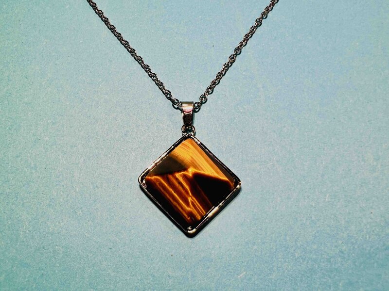 Ciondolo Piramide Occhio di Tigre misura cristallo 2 x 2 x1,5 cm peso 8 g. circa. Catenina in acciaio lunga 50 cm con chiusura a moschettone. Se si desidera la catenina più lunga o più corta scrivere una nota quando il prodotto si trova nel carrello.