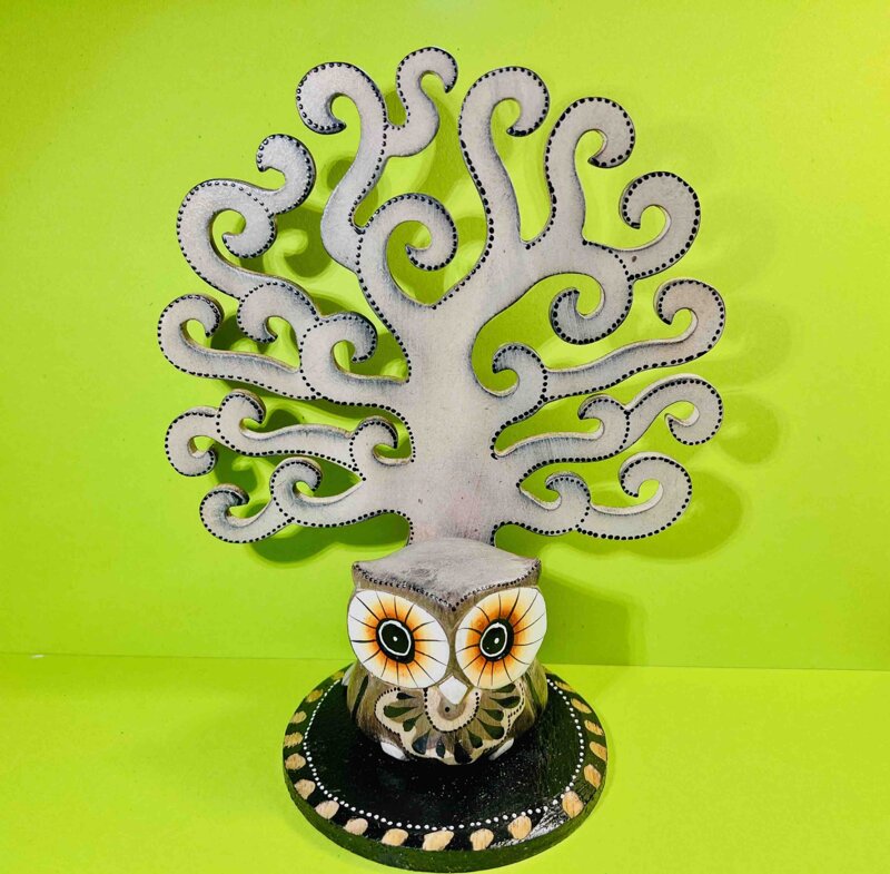 Albero della Vita con Gufo grigio in legno. Lavorato a mano a Bali. Misura 21 x 17 x 10 cm. peso 130 g.