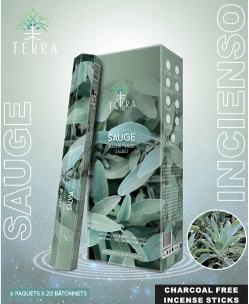 Incenso Terra senza carbone profumazione Salvia Bianca, confezione da 20 bastoncini ognuno ha una durata di circa 50 minuti. Terra produce incensi artigianali senza carbone per offrire un'esperienza olfattiva pura e autentica con ingredienti naturali di alta qualità. Ogni bastoncino diffonde una fragranza ricca e complessa, per un'atmosfera rilassante e rassenerante. Confezione tubo esagonale 20 bastoncini peso 30 g. Prodotto in India.